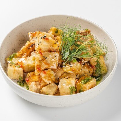 Баклажан очищенный,филе куриное,крахмал картофельный,соус Чили кисло-сладкий,соус Терияки,чеснок,арахис,зелень