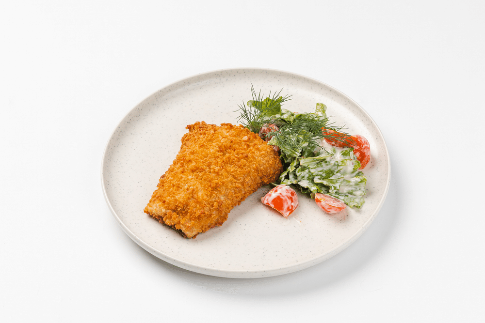 Кета, яйцо куриное, сухарь, салатный лист, помидоры, соус цезарь