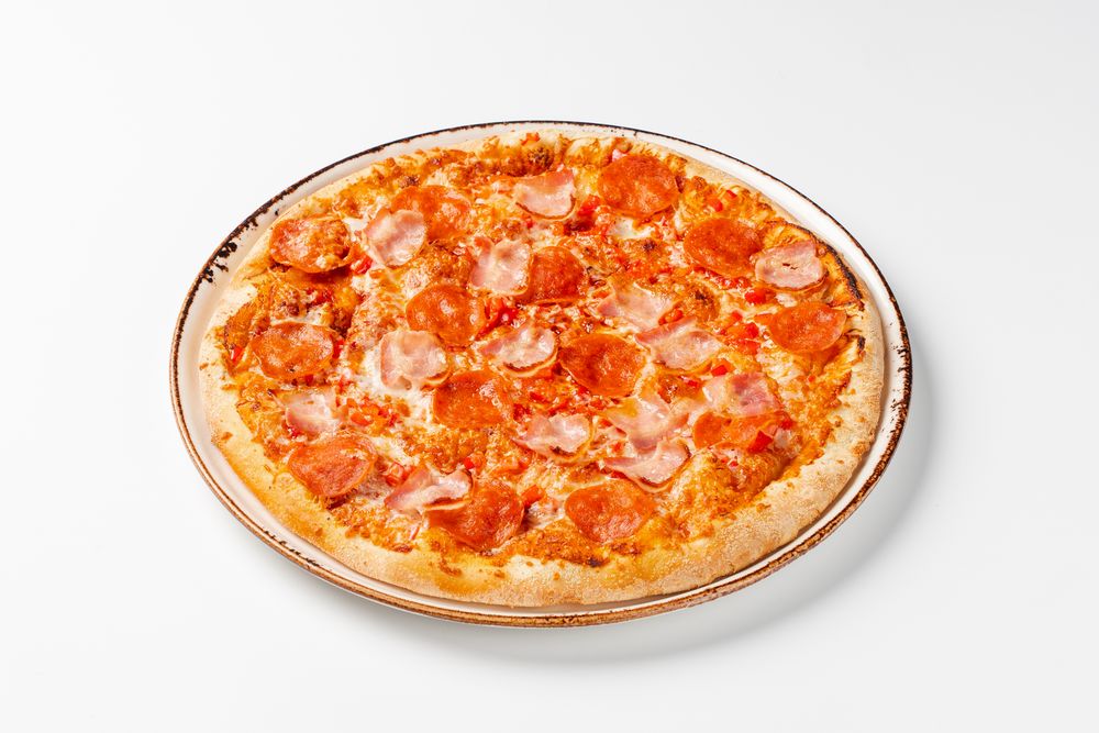 тесто для пиццы, бекон, перец болгарский, сыр моцарелла, пеперони